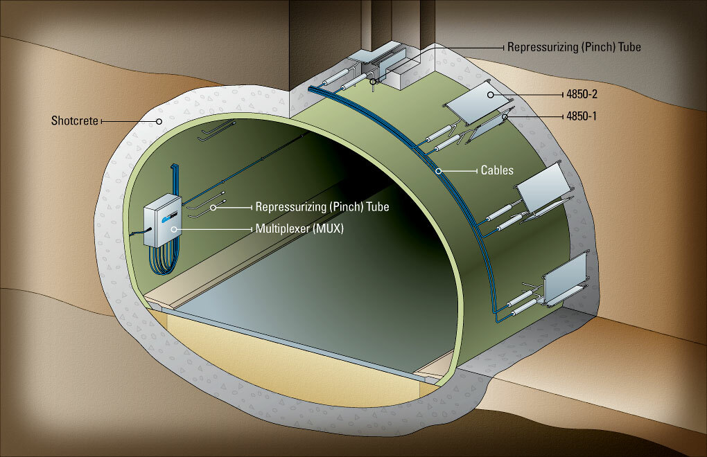 Cảm biến đo ứng xuất NATM Model 4850 gồm ứng suất tiếp tuyến (4850-1) và xuyên tâm (4850-2) để trong lớp lót đường hầm bê tông phun. Các tế bào bao gồm hai tấm thép hình chữ nhật được hàn với nhau xung quanh ngoại vi bằng chất lỏng khử khí chiếm không gian giữa các tấm. Một ống ngắn nối tế bào với bộ chuyển đổi áp suất dây rung. Một ống ứng suất trước được cung cấp để mở rộng ô sau khi bê tông đã đóng rắn. Các ô loại này cũng được sử dụng để đo ứng suất trong bê tông khối lớn.