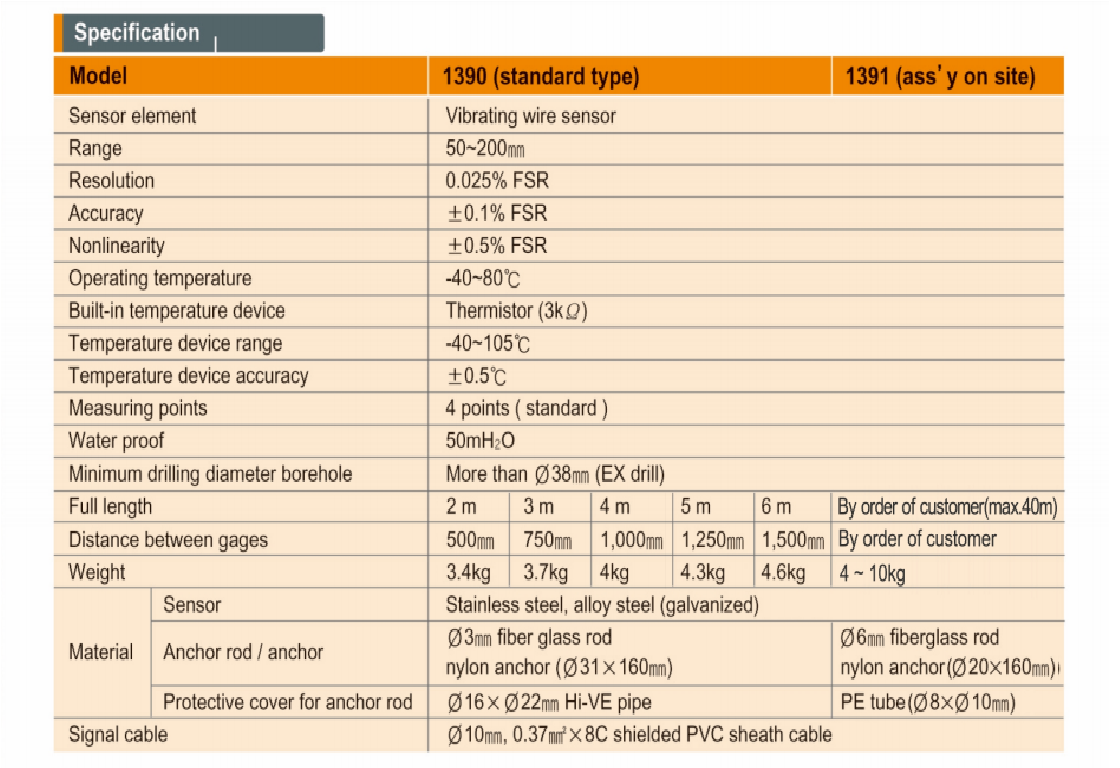Máy đo độ giãn dạng que Model 1390 VW là bài báo được cấp bằng sáng chế (Korea patent 0490826) của Ace Instrument. Nó có bộ phận cảm biến được xây dựng với 4 cảm biến dịch chuyển VW nhỏ được chống thấm nước và chống ẩm, neo để xử lý vữa cho đá nền đường hầm và thanh neo được làm bằng sợi thủy tinh để cung cấp dịch chuyển đến cảm biến.