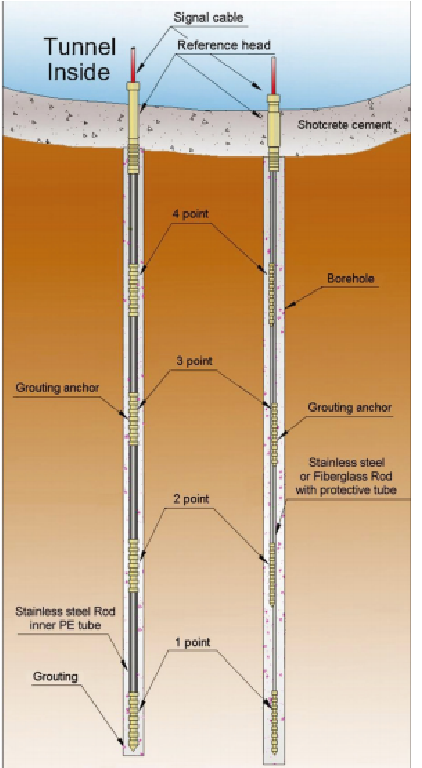 Máy đo độ giãn dạng thanh VW rất hữu ích để đo sự dịch chuyển của mặt đất bằng cách đào hội tụ trong lòng đất như đường hầm, hầm mỏ hoặc ống dẫn chung và để đo biến dạng của độ dốc và sự dịch chuyển ngang hoặc dọc của đất hoặc đá trong đường hầm.